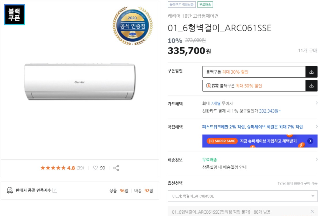 인버터형 에어컨이 장기적으로 좋다고는 하지만 1년 12달 중 에어컨 켜는 날이 그렇게 많지 않을 것 같기도 하고, 나 처럼 좁은 공간에서 산다면 그렇게 큰 차이가 나지 않는다는 후기도 많이 봤기 때문에 그냥 정속형으로 구입 했다. 가전은 LG라는 인식이 마음 깊이 남아 있어 약 10만원 정도 차이가 나는 휘센도 고민을 조금 하기는 했지만 정말 오래 살아도 6년 정도면 떠나야 하는 공간이니.. 고가의 가구, 전자제품에는 큰 욕심을 안부리는 것이 좋을 듯 하다.