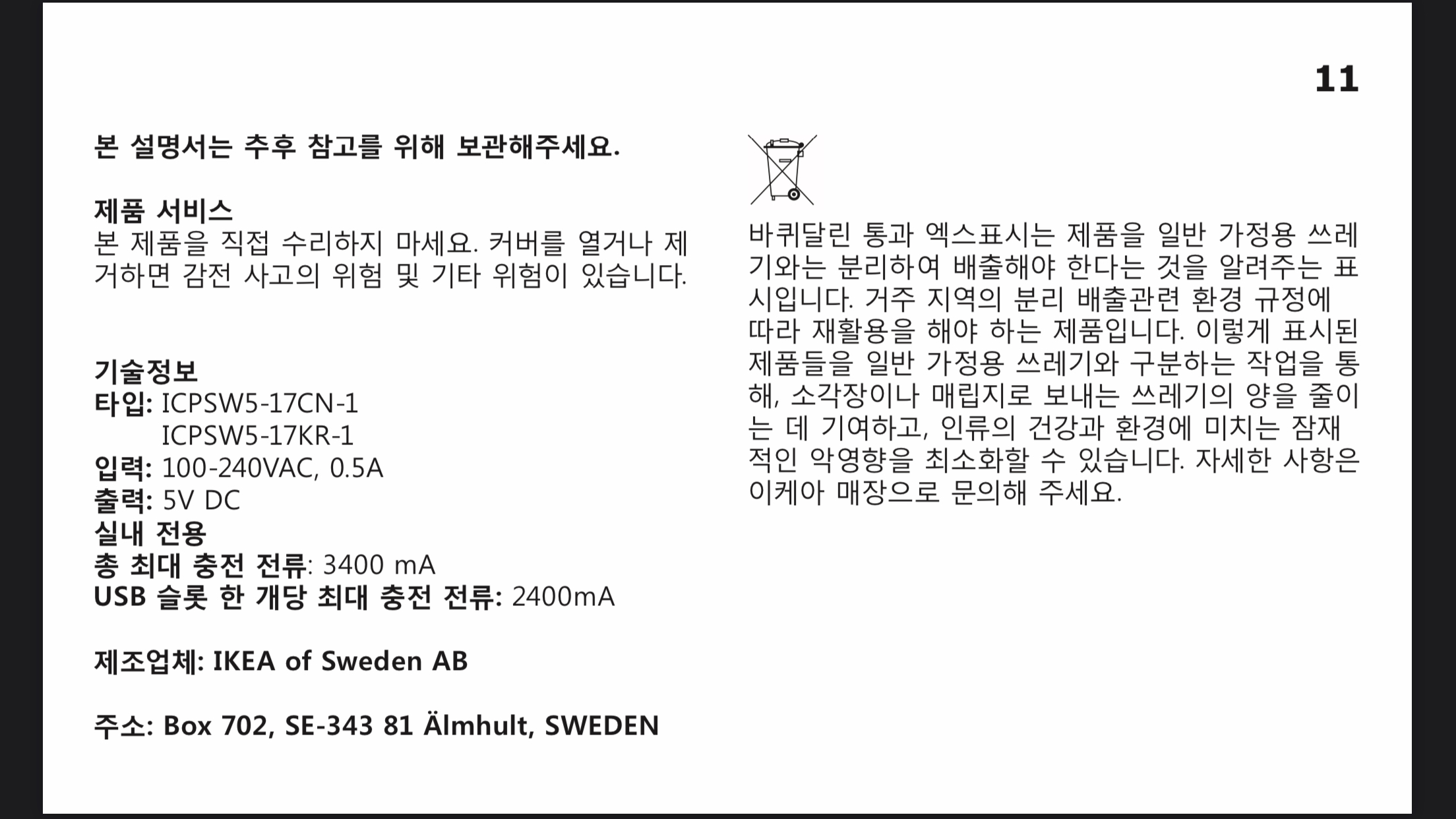 집에 와서 이케아 홈페이지에서 해당 제품을 검색 해 보니 이렇게 설명이 나온다. 각종 안정장치도 잘 되어 있는 것 같아서 안전이나 출력상의 걱정은 하지 않아도 될까 하는 생각이 든다. 테스터기도 없고 해서 시험을 해 볼 수는 없지만 브랜드 네이밍이 있으니 오픈마켓에서 구매하는 어설픈 충전기 보다는 낫지 않을까 하는 생각을 해 본다.